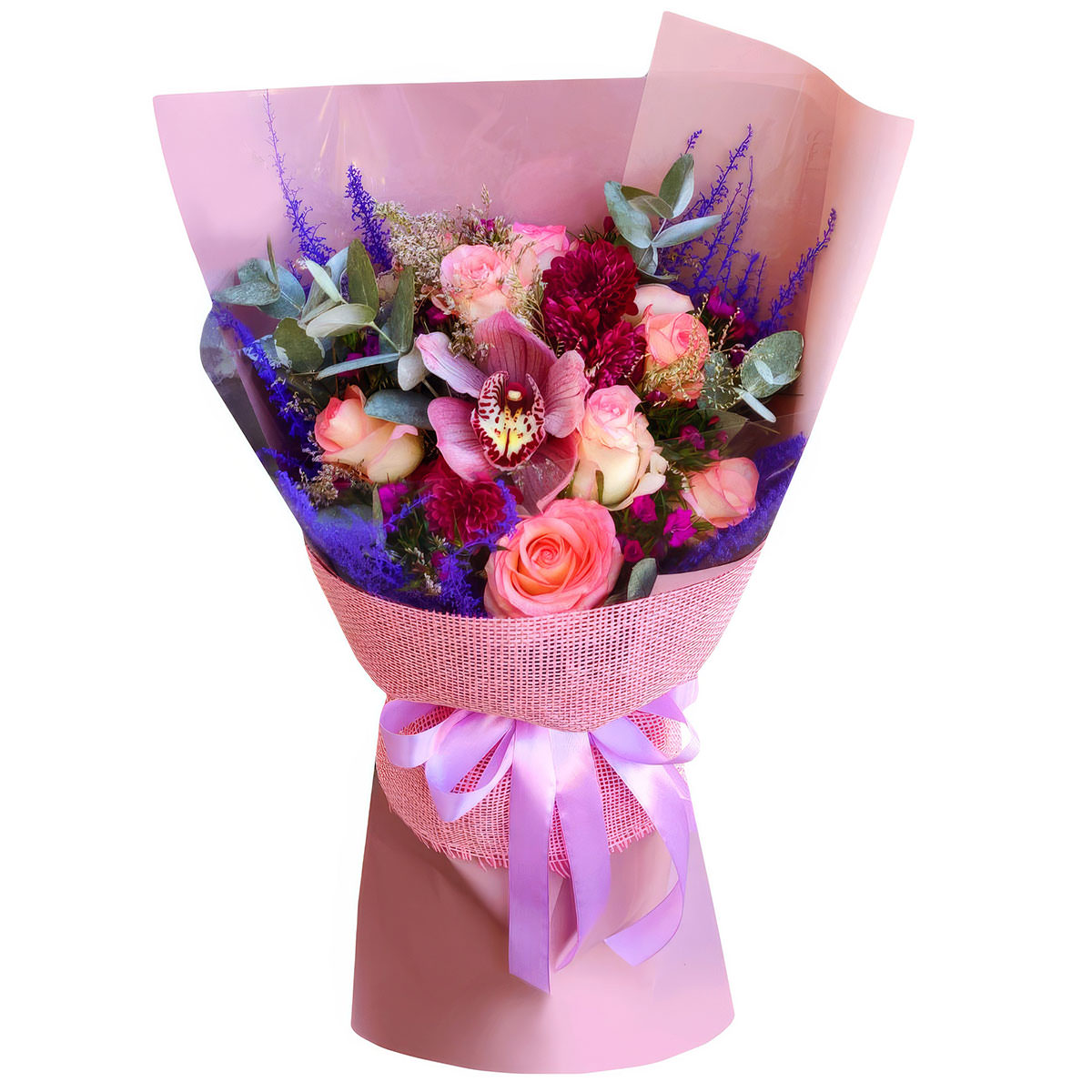 Орхидея розовая, роза одноголовая розовая, георгина мини бордовая, вероника, эвкалипт. Упаковка (лента, пленка, крафт, сетка, пленка матовая)