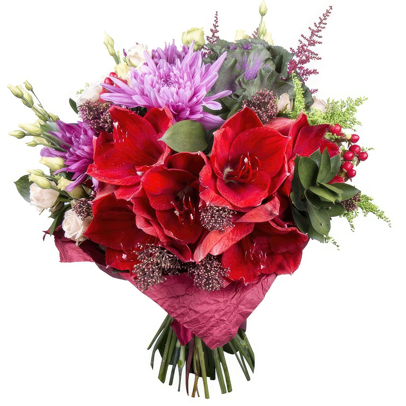 Амариллис, астильба, брассика, гиперикум, роза кустовая белая, скиммия, солидаго, хризантема сиреневая, эустома белая. Упаковка (лента, пленка, крафт, сетка, пленка матовая)