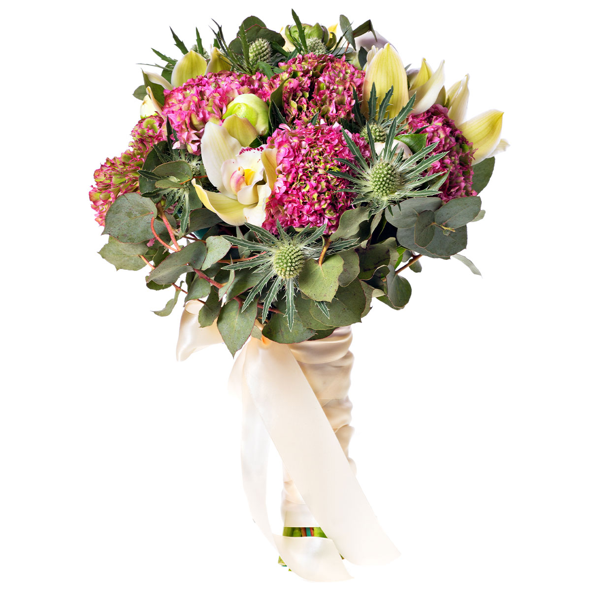 Орхидея белая, гортензия розовая, эрингиум, эвкалипт. Упаковка (лента, пленка, крафт, сетка, пленка матовая)
