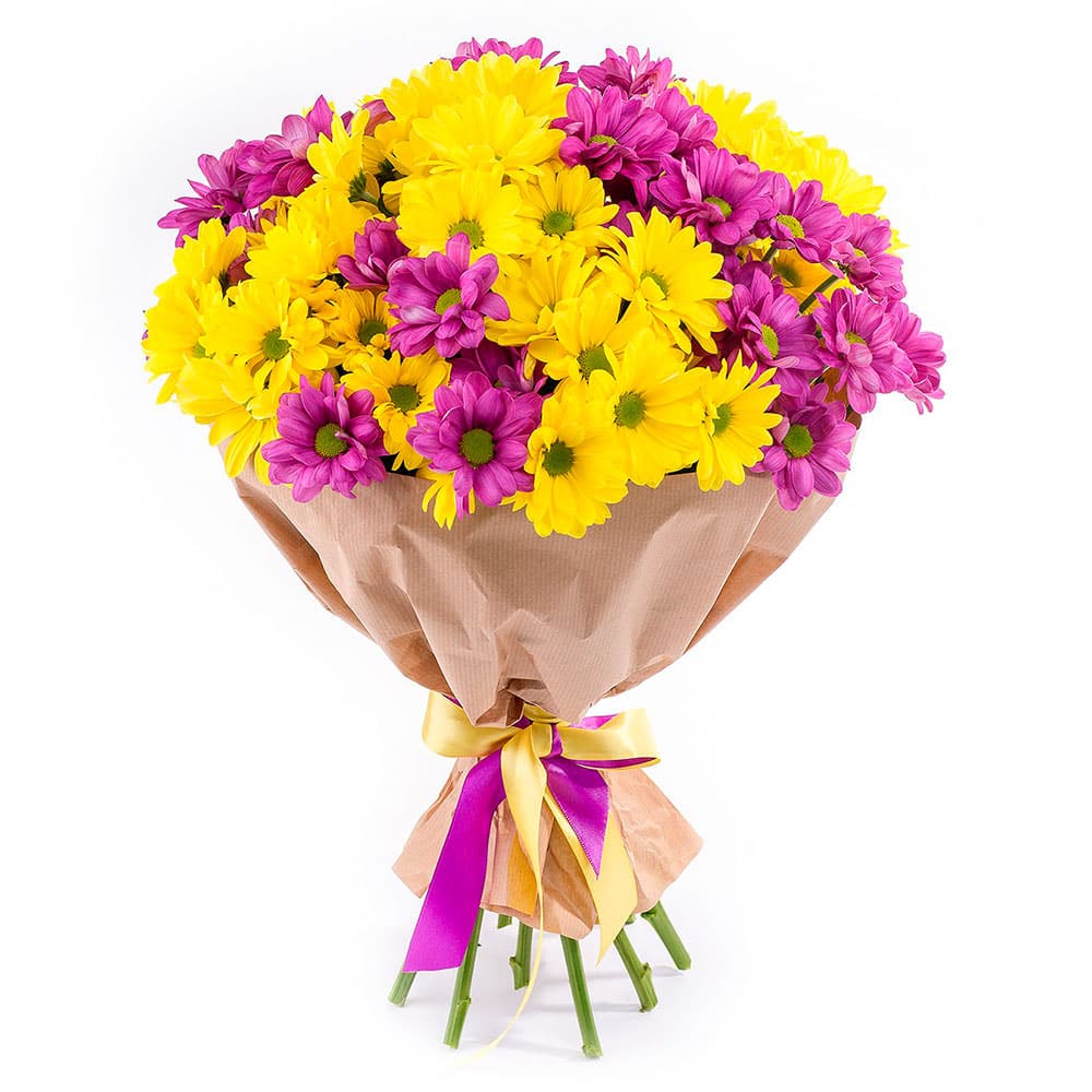 Хризантема кустовая желтая и розовая. Упаковка (лента, пленка, крафт, сетка, пленка матовая)