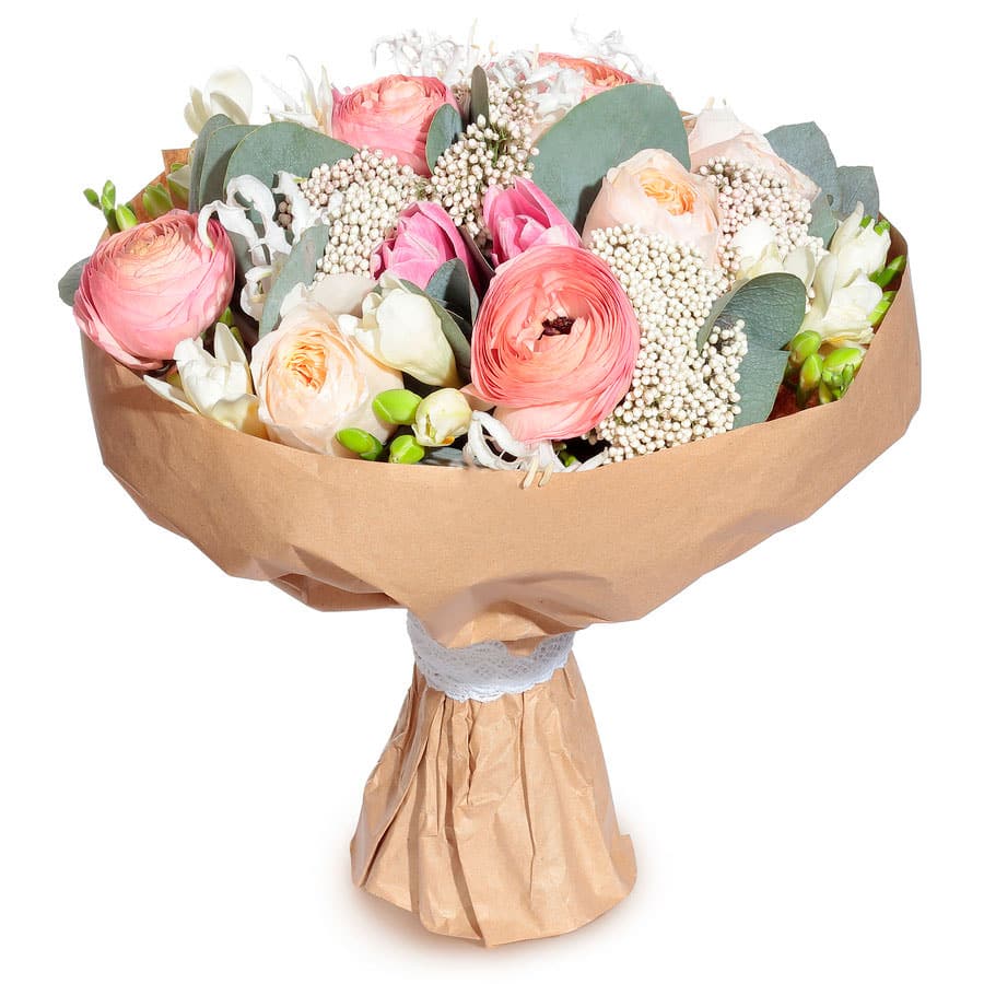Роза пионовидная белая, ранункулюс розовый, тюльпан розовый, фрезия белая, эвкалипт, озотамнус. Упаковка (лента, пленка, крафт, сетка, пленка матовая)