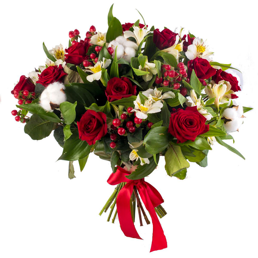 Роза одноголовая красная, гиперкум, альстромерия белая, хлопок, зелень. Упаковка (лента, пленка, крафт, сетка, пленка матовая)