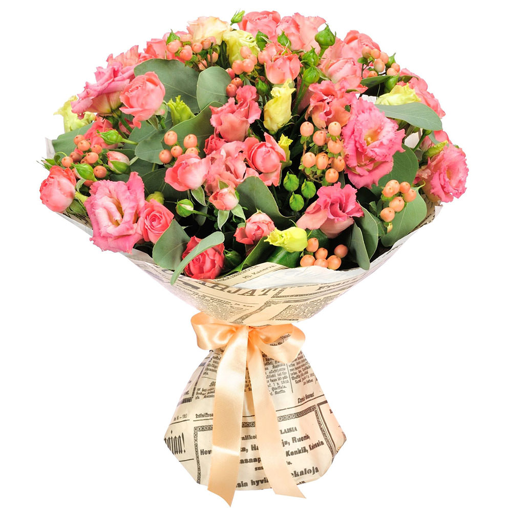 Эустома розовая и желтая, гиперикум, роза кустовая розовая, эвкалипт. Упаковка (лента, пленка, крафт, сетка, пленка матовая)