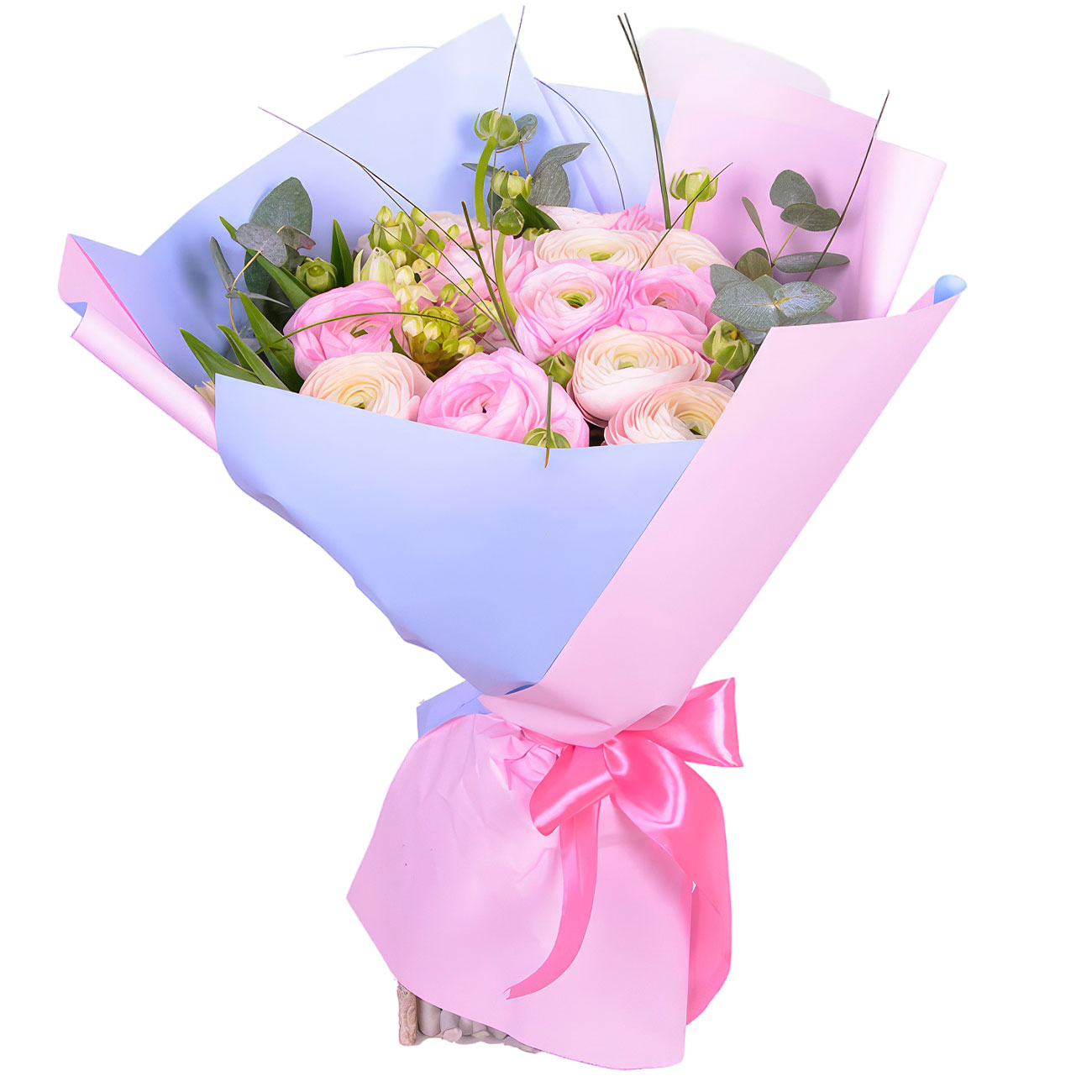 Ранункулюс розовый, эвкалипт. Упаковка (лента, пленка, крафт, сетка, пленка матовая)