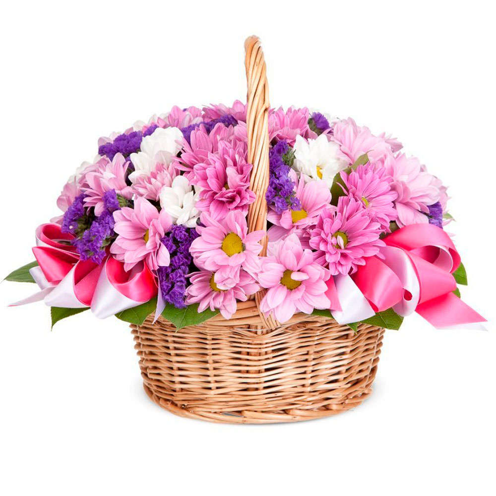 Хризантема кустовая микс (розовая, белая), статица. Упаковка (Корзина, оазис).