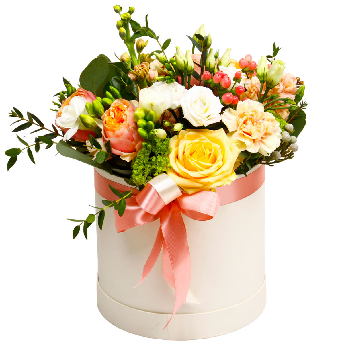 Роза одноголовая персиковая и желтая, фрезия белая, эустома белая, гвоздика кремовая, гиперикум, бруния, вибурнум, эвкалипт. Упаковка (шляпная коробка, квадратный бокс, коробка сердце, оазис)